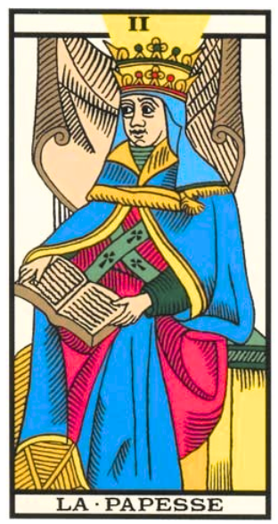 Image : assise entre deux colonnes, tenant un livre ou un rouleau fermé, symbole du savoir caché et du mystère.